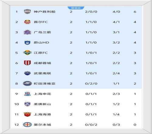 神户胜利船以2战全胜积6分跃居榜首,两连败的墨尔本城0分垫底。