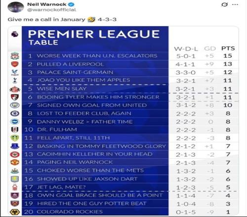 雷速体育10月2日宣 76岁的传奇救火教练尼尔·沃诺克通过社媒(X)发布一份动态,对英超各队的近况进行了调侃。他还用“一月份给我电话”来开玩笑,表示如果曼联解雇阿莫林,他会复出执教红魔。