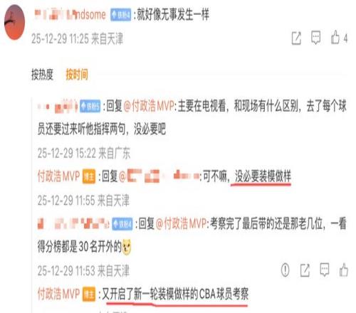 付政浩在和网友互动时直言:“又开启了新一轮装模做样的CBA球员考察”,并且一针见血指出:“郭导已经黔驴技穷,早点下课,回到CBA找个中下游球队好好抓训练抓防守继续当名帅吧。别再祸祸国家队了,国家队连续输给韩国,这是在砸所有中国篮球人的饭碗,一举把中国篮球的商业价值全干崩了。放过中国篮球吧。”